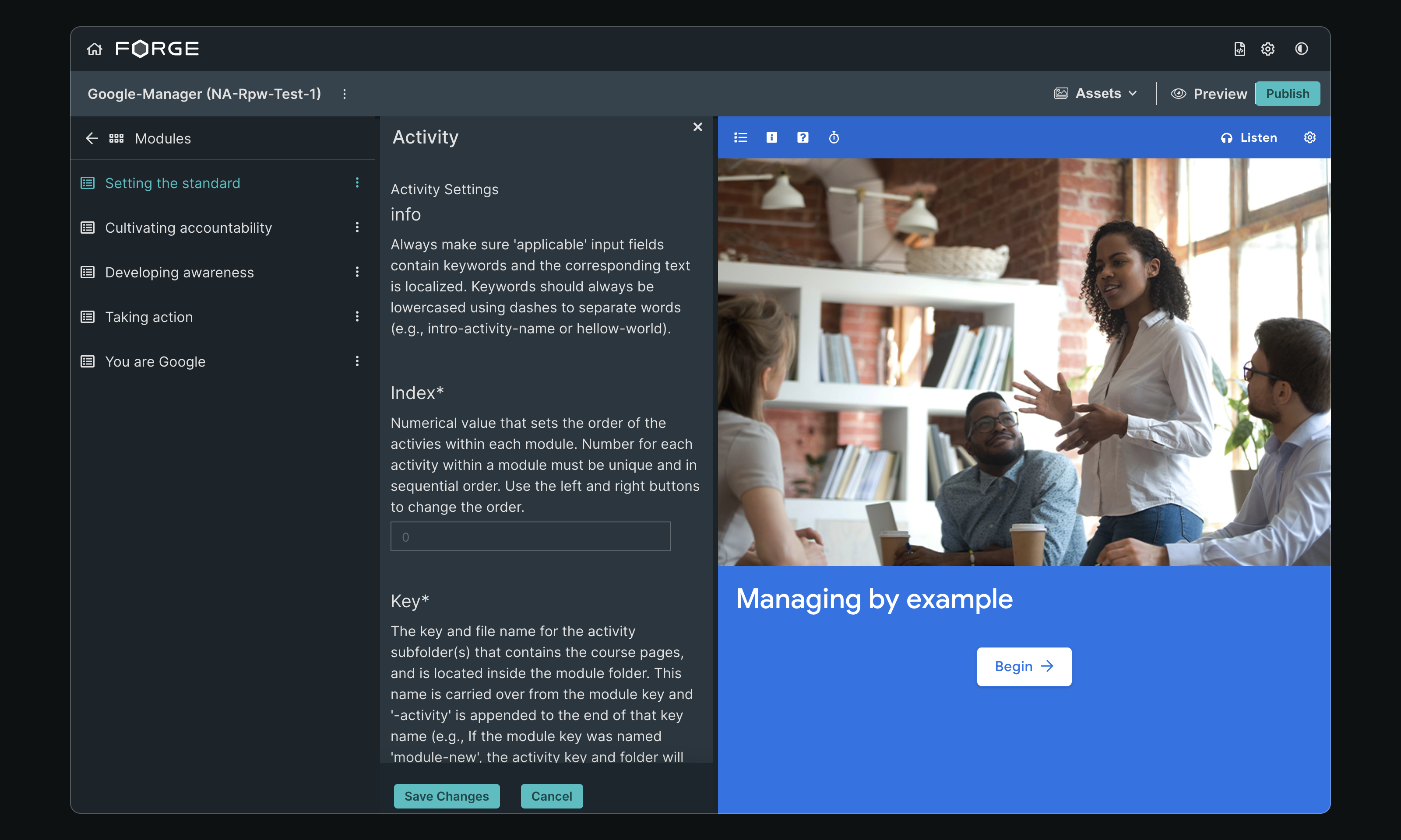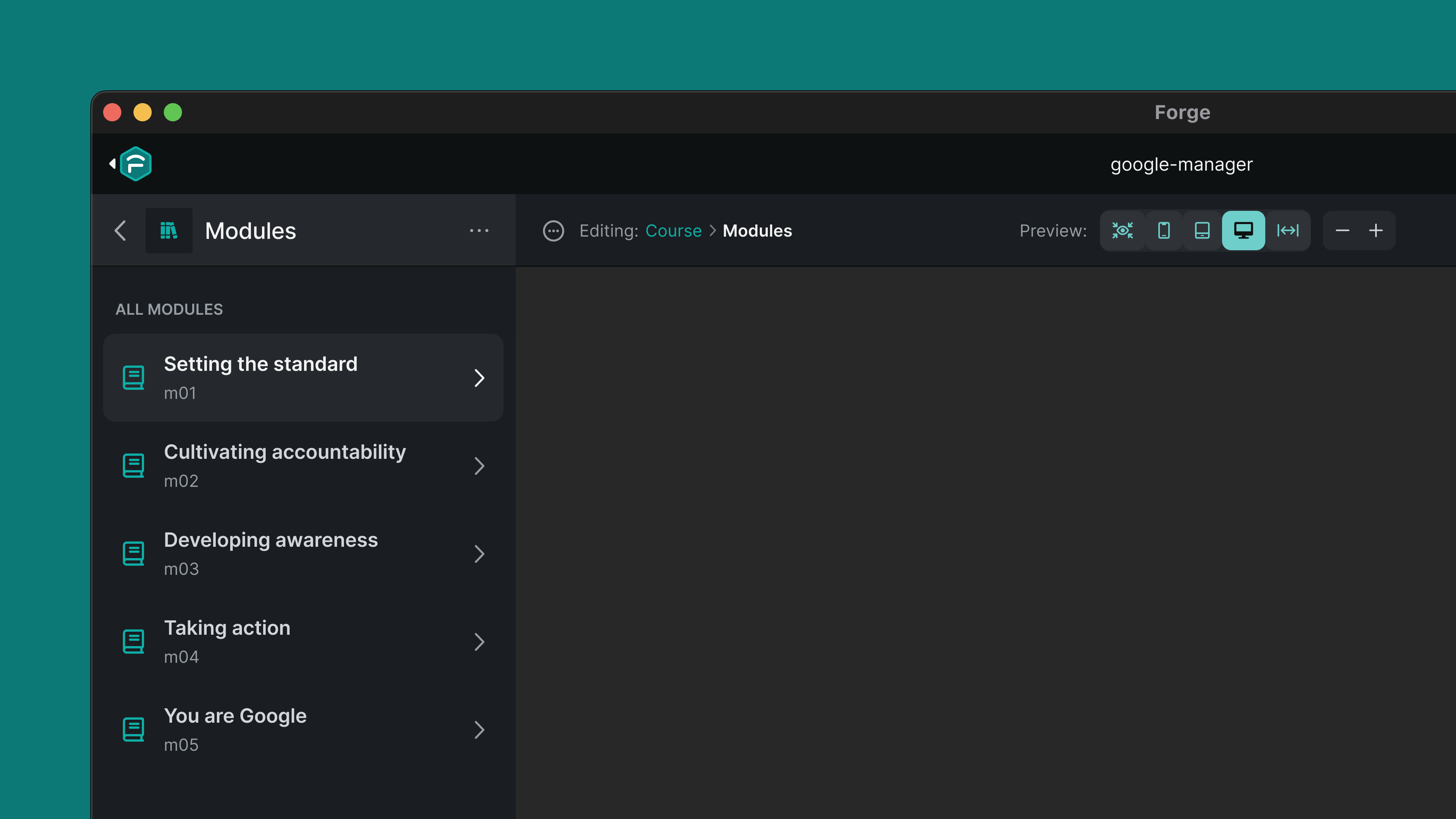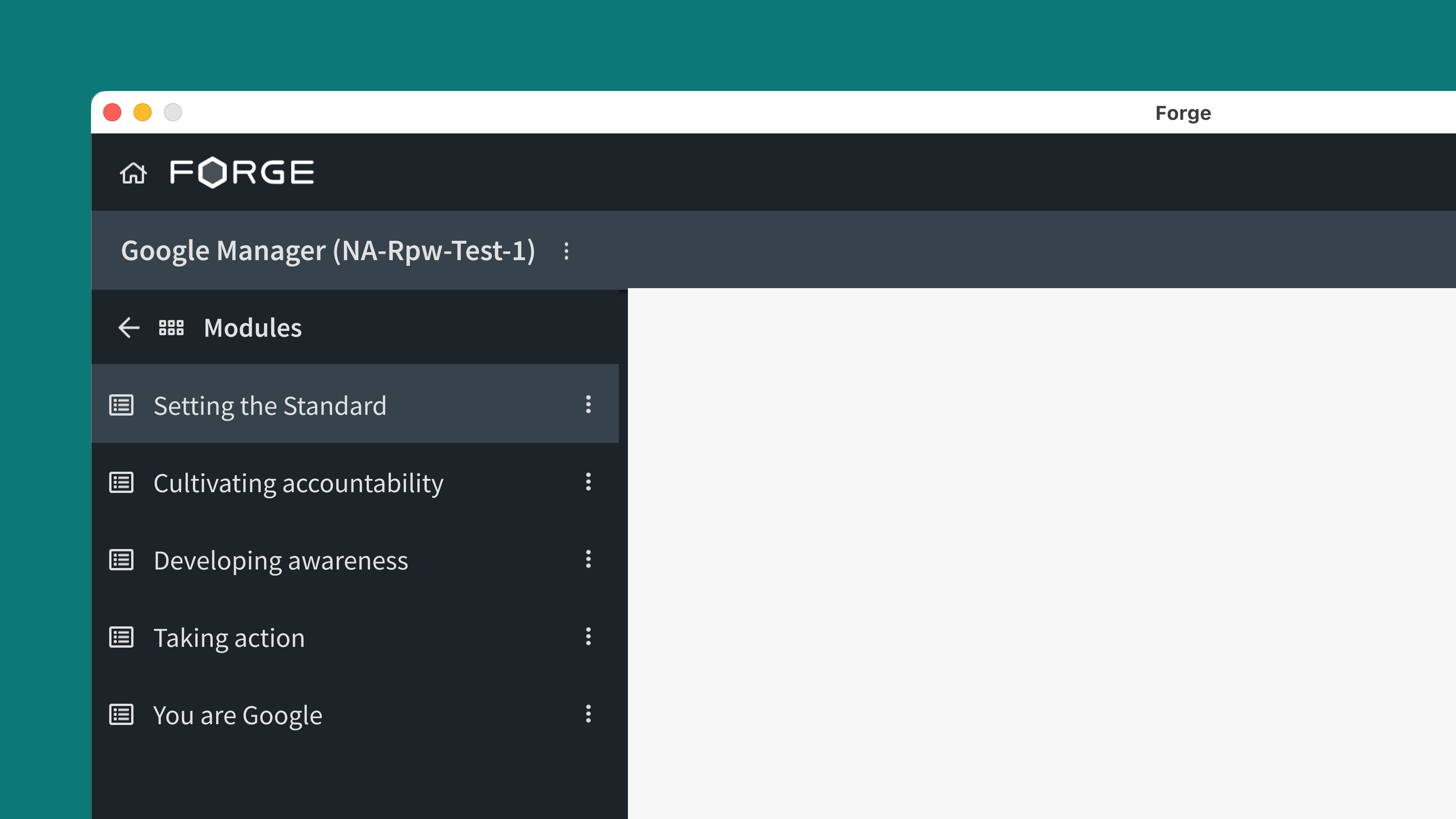 Forge is the primary tool used by EVERFI's Implementation team, who translate course designs into interactive e-learning products. It's a Git-connected Electron app that provides an interface for a local development environment. Forge leverages the EVERFI SDK and component library (aka Furnace) to allow for course creation and ongoing maintenance.