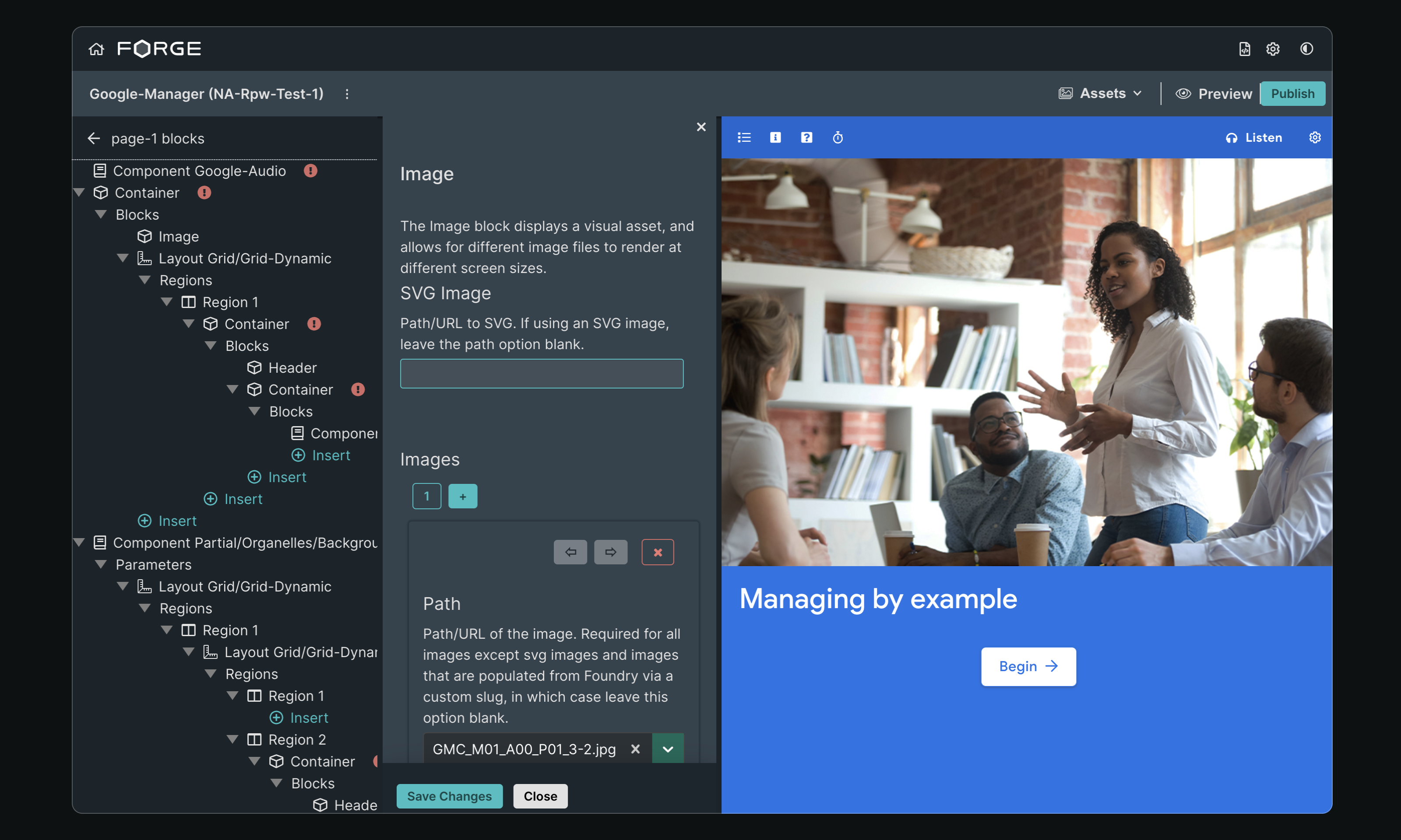 A crucial aspect of Forge's utility derives from having its edit views auto-generated by page and component schema.