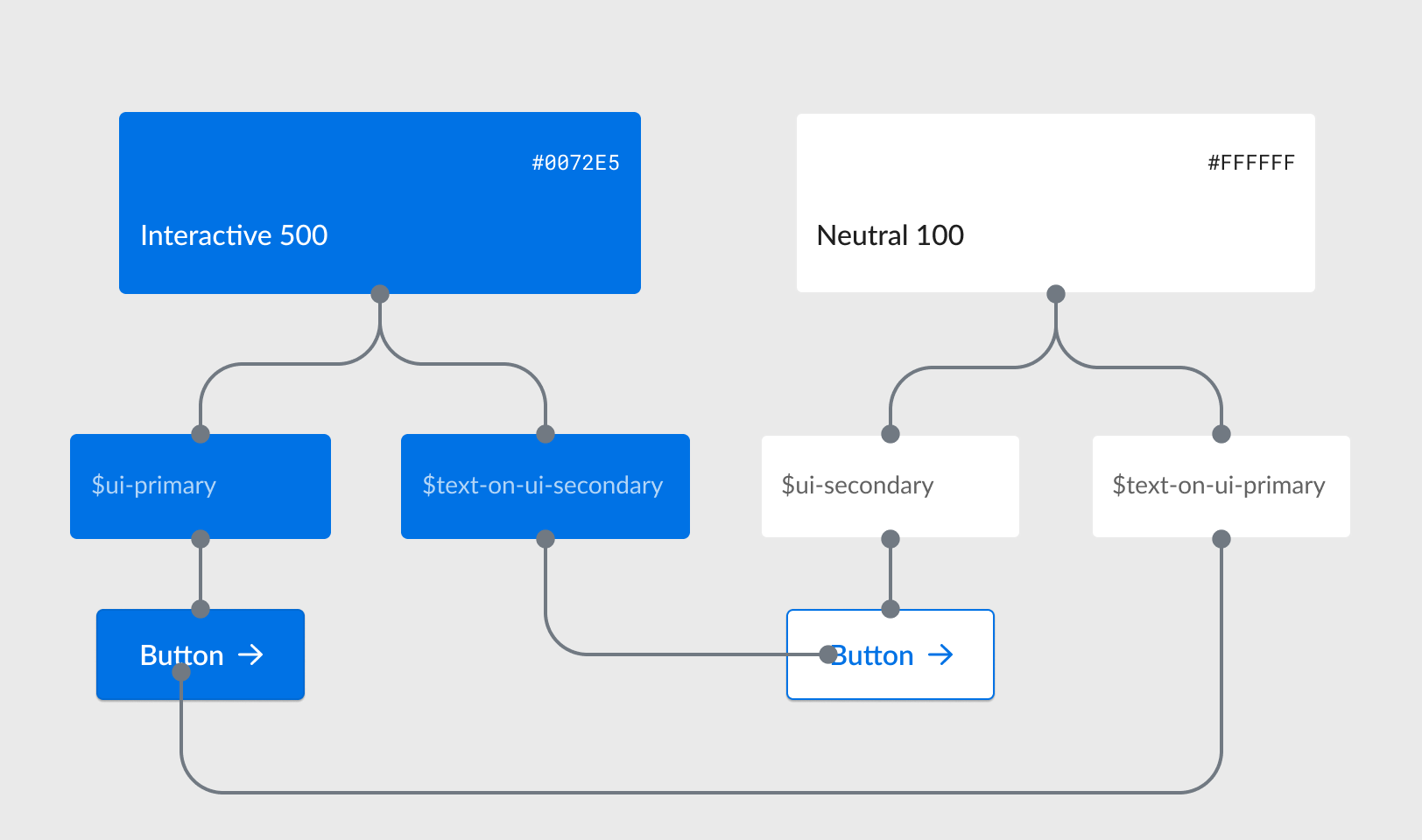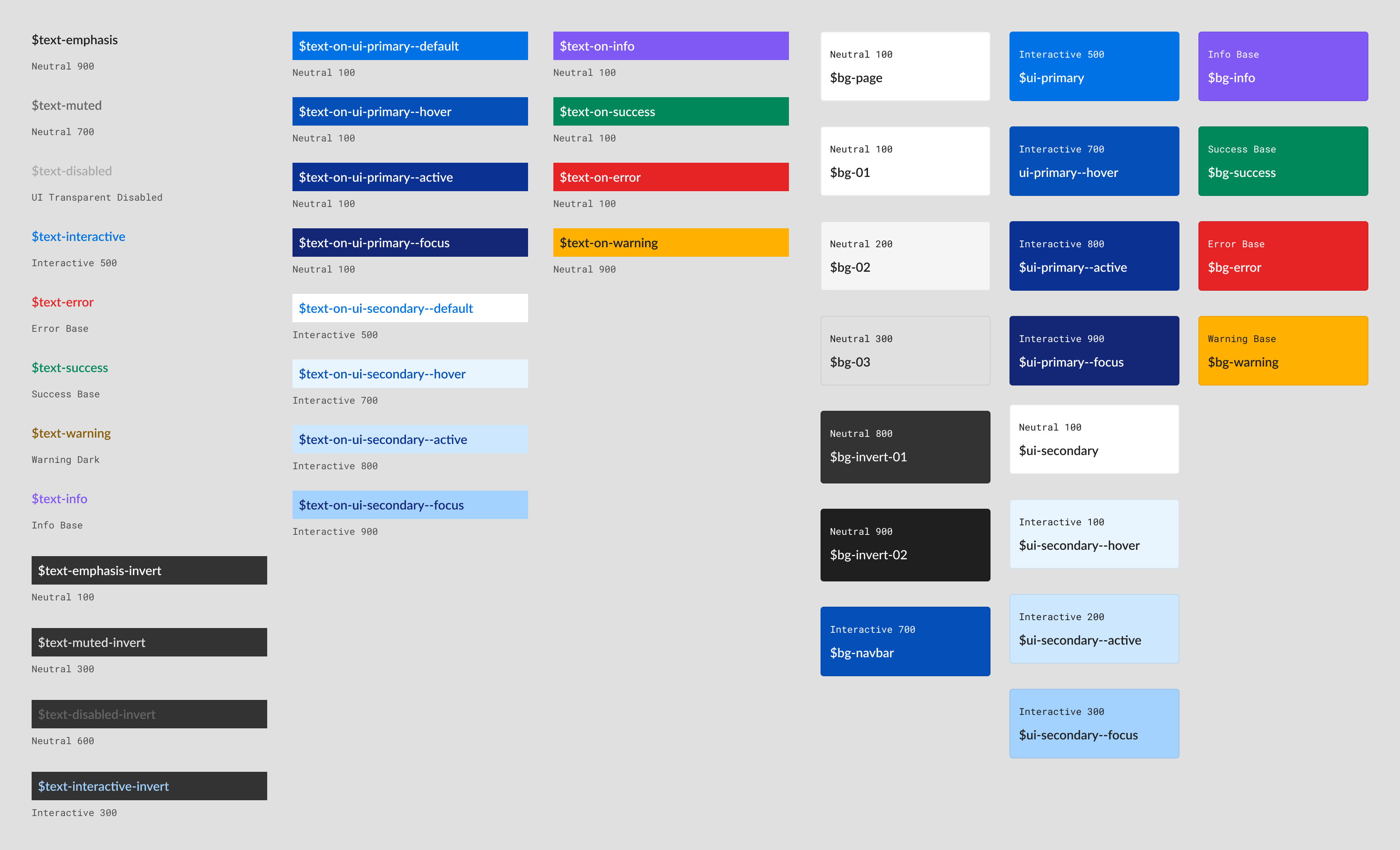 This distinction is essential because $text-on-ui-secondary always pairs with $ui-secondary backgrounds, while $text-interactive is used for links that may appear on various background colors.
