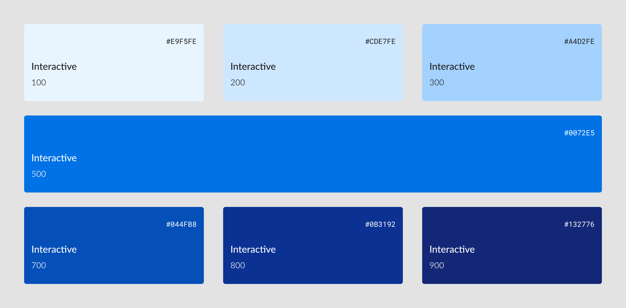 To reduce complexity and help focus learner attention, a single primary color scale is used to indicate interactivity in a theme. These are ordered from lightest (100) to darkest (900), skipping 400 and 600 to enforce visual separation between primary and secondary elements.