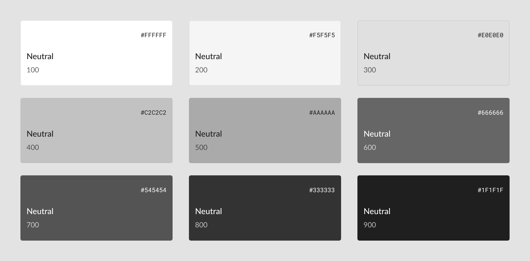The neutral palette is used for text, borders, and surface states. It ranges from near-white (100) to near-black (900) non-linearly to avoid muddy middle greys that have poor contrast with white/black.