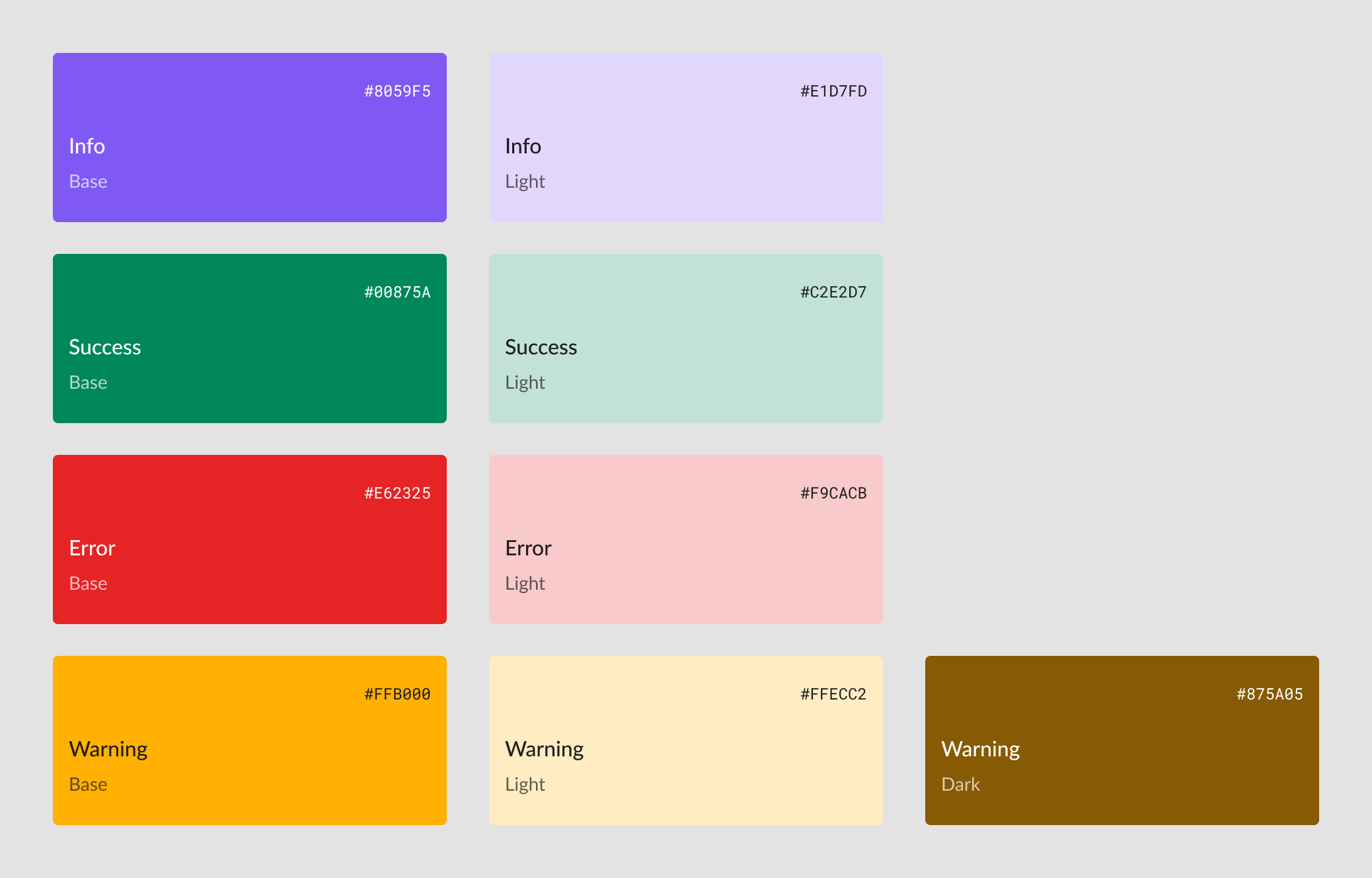 Semantic status colors convey meaning through convention or repeated use outside the primary interactive color. These are chiefly used for feedback or status indicators, covering Success, Warning, Error, and Informational contexts.