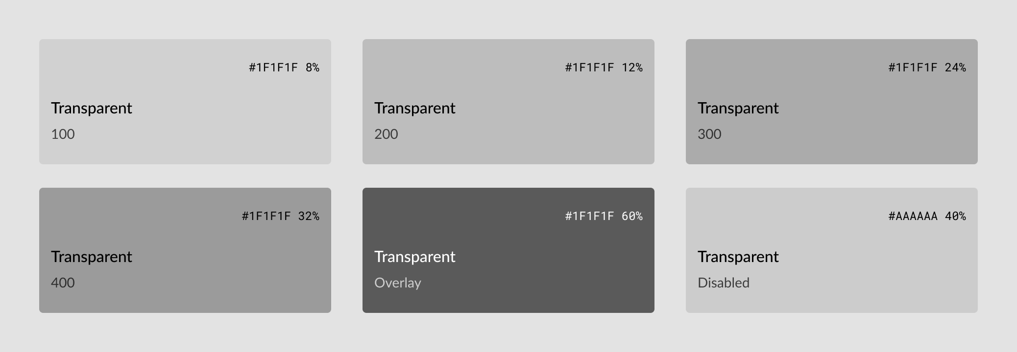 The transparent neutral palette is designed for subdued or disabled UI elements, dividers, or accents, typically using opacities of Neutral 900, but are defined separately for greater theme control.