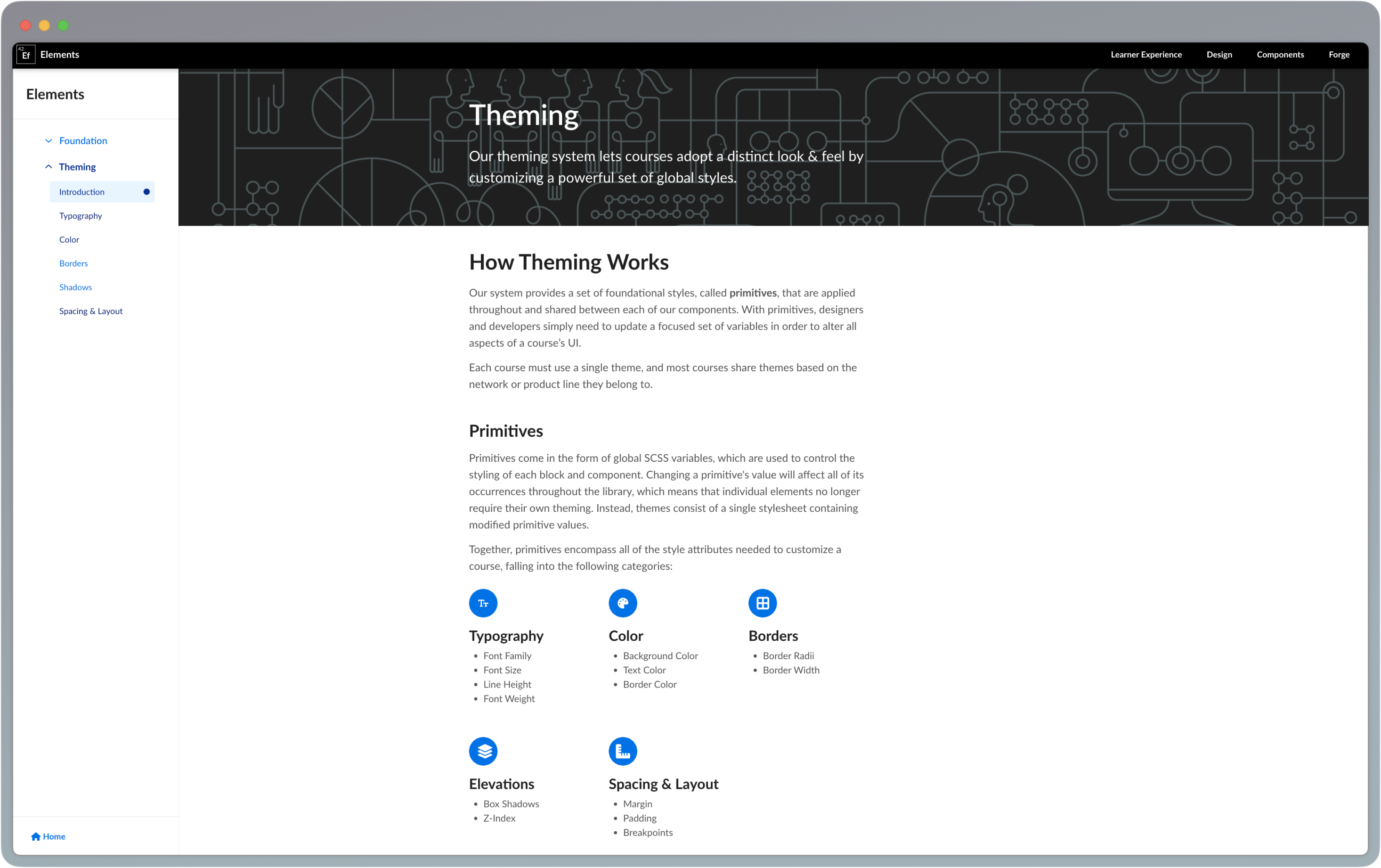 I worked to distill all styling needed for a theme into seven categories that would power the system. These were Primitives, a constrained set of foundational design properties that are applied to each element in the design system.