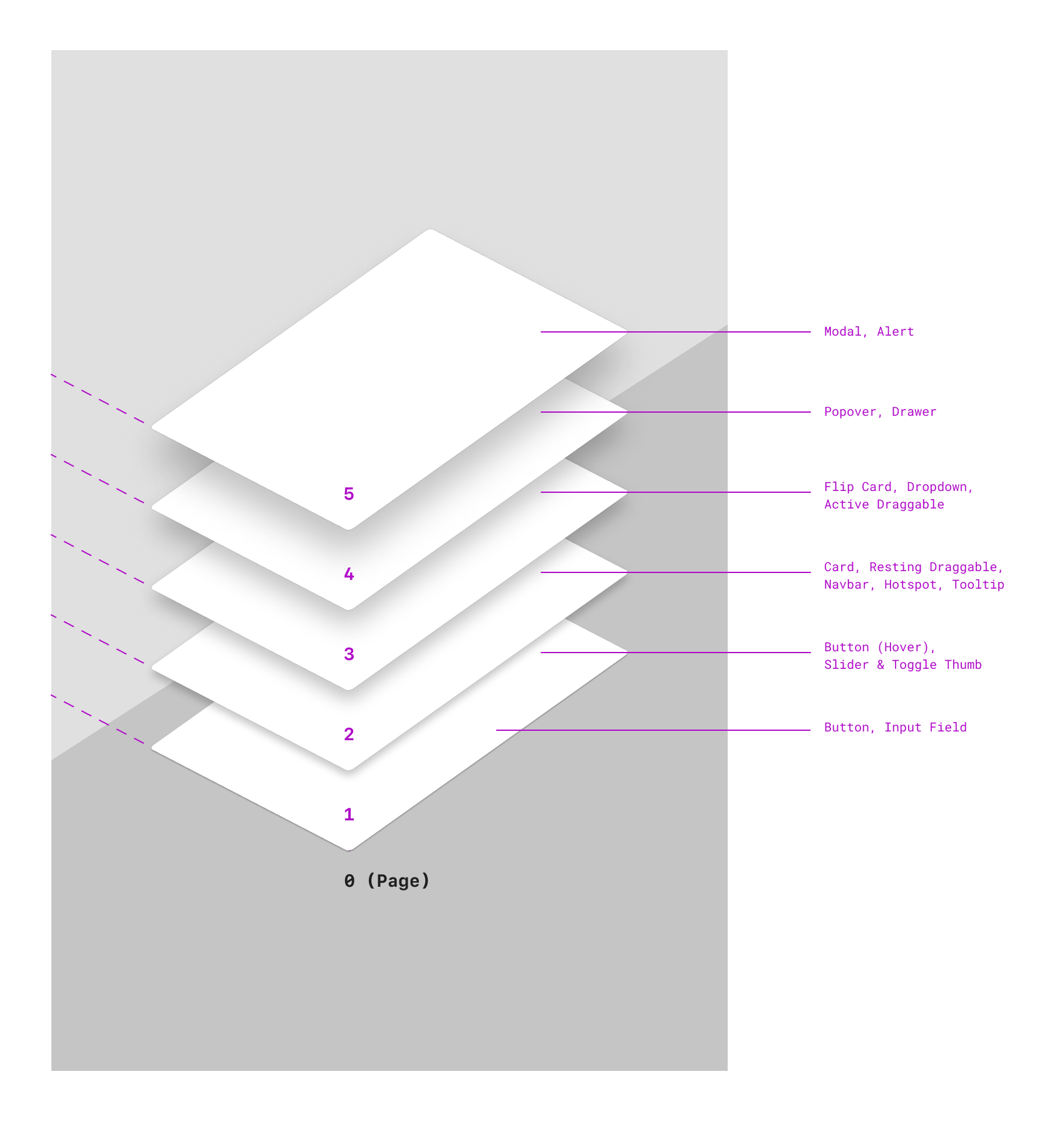 Shadows are defined as five gradually increasing elevations, corresponding to perceived z-index, or its relative distance "above" the page.