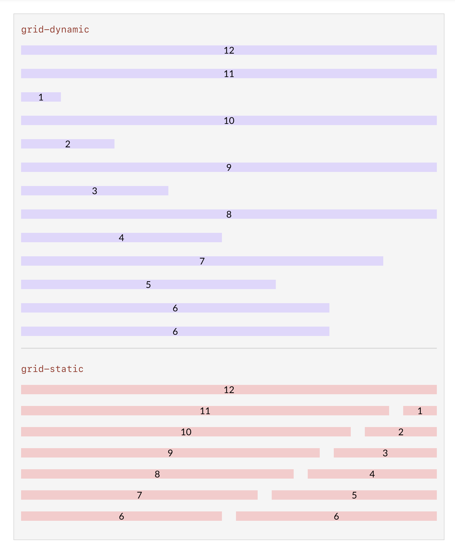 Grid examples at the tablet breakpoint. Note that the Dynamic Grid maxes out at 8 columns, while the Static Grid displays 12.