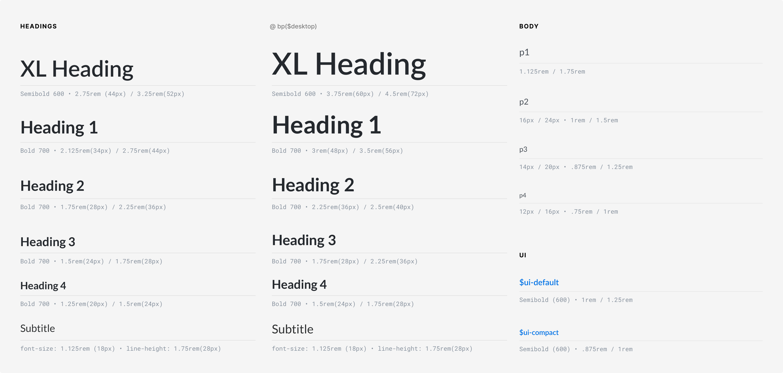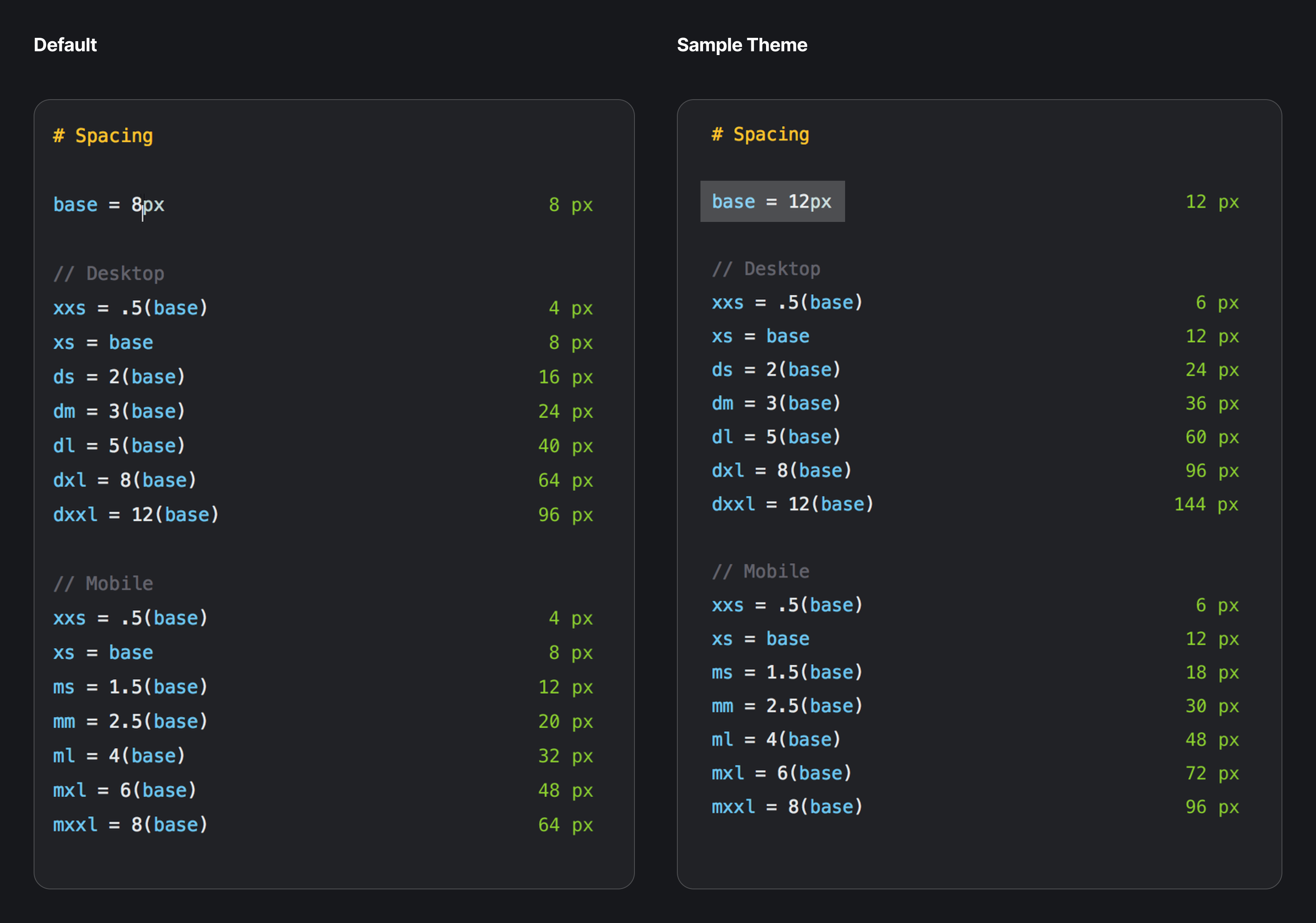Spacing is calculated using a base unit ($spacing-xs) multiplied by different scales on mobile and desktop breakpoints.