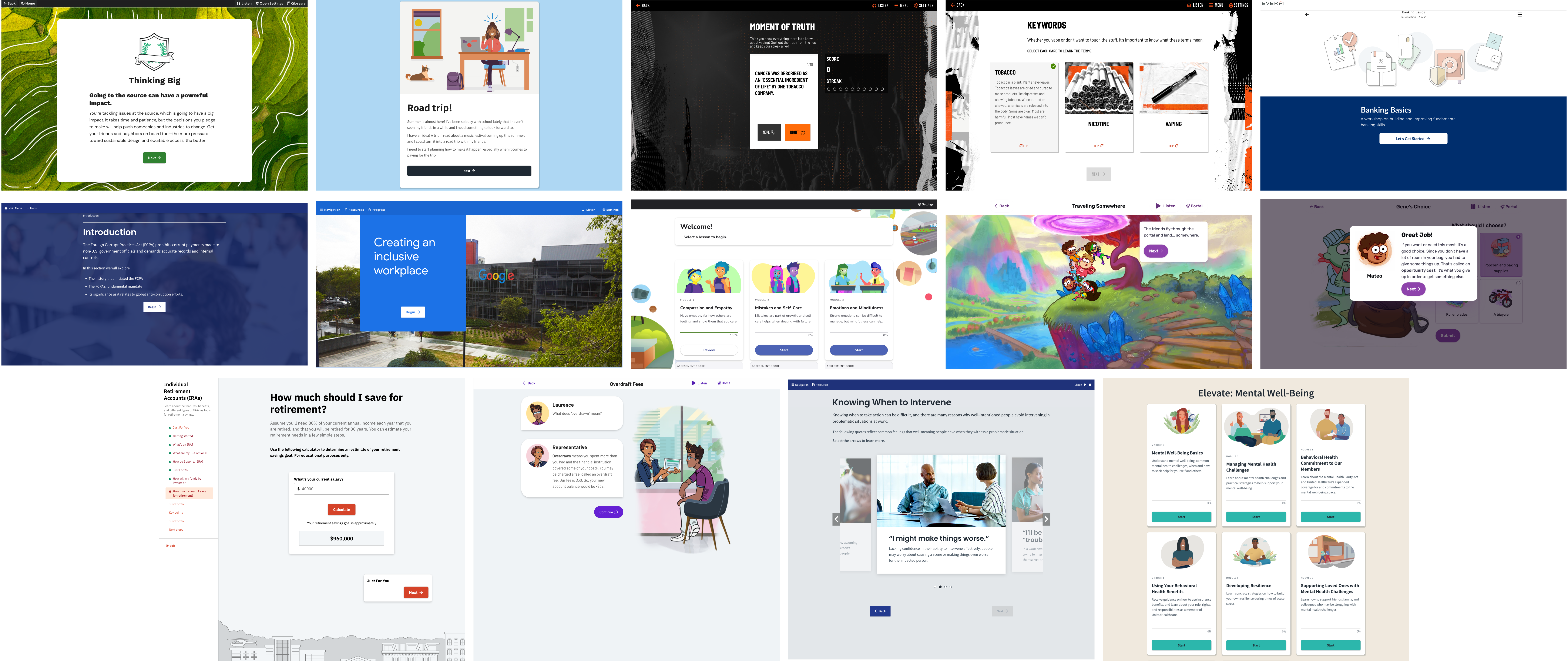 EVERFI has a large portfolio of e-learning courses, ranging in subject from Early Literacy to Workplace Inclusivity to the crowd favorite, Bloodborne Pathogen Training. Historically, courses were one-offs designed by individual teams using building blocks provided by our SDK, styling and composing them in unique ways. However, there was no feedback loop to collate these stylesheets, templates, and interactions for later reuse, so each new course build started from scratch.